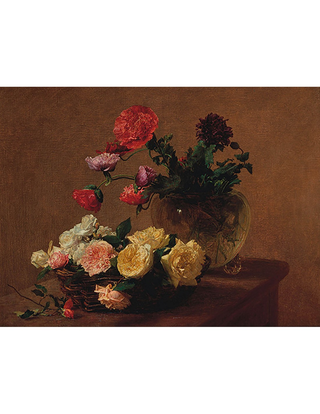 Amapolas en un jarrón de cristal y rosas en una cesta (detalle)