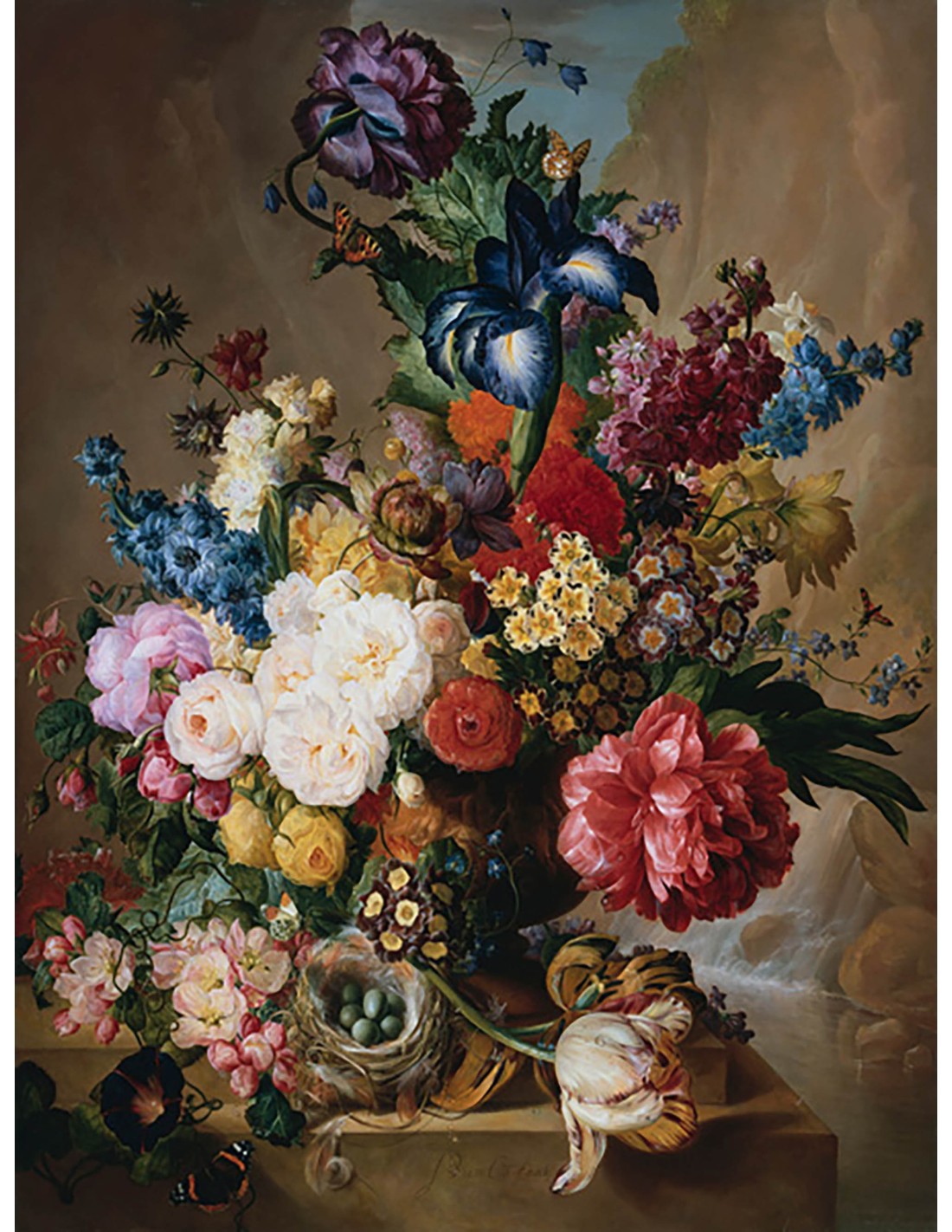Amapolas, peonías y otras flores en un jarrón de terracota