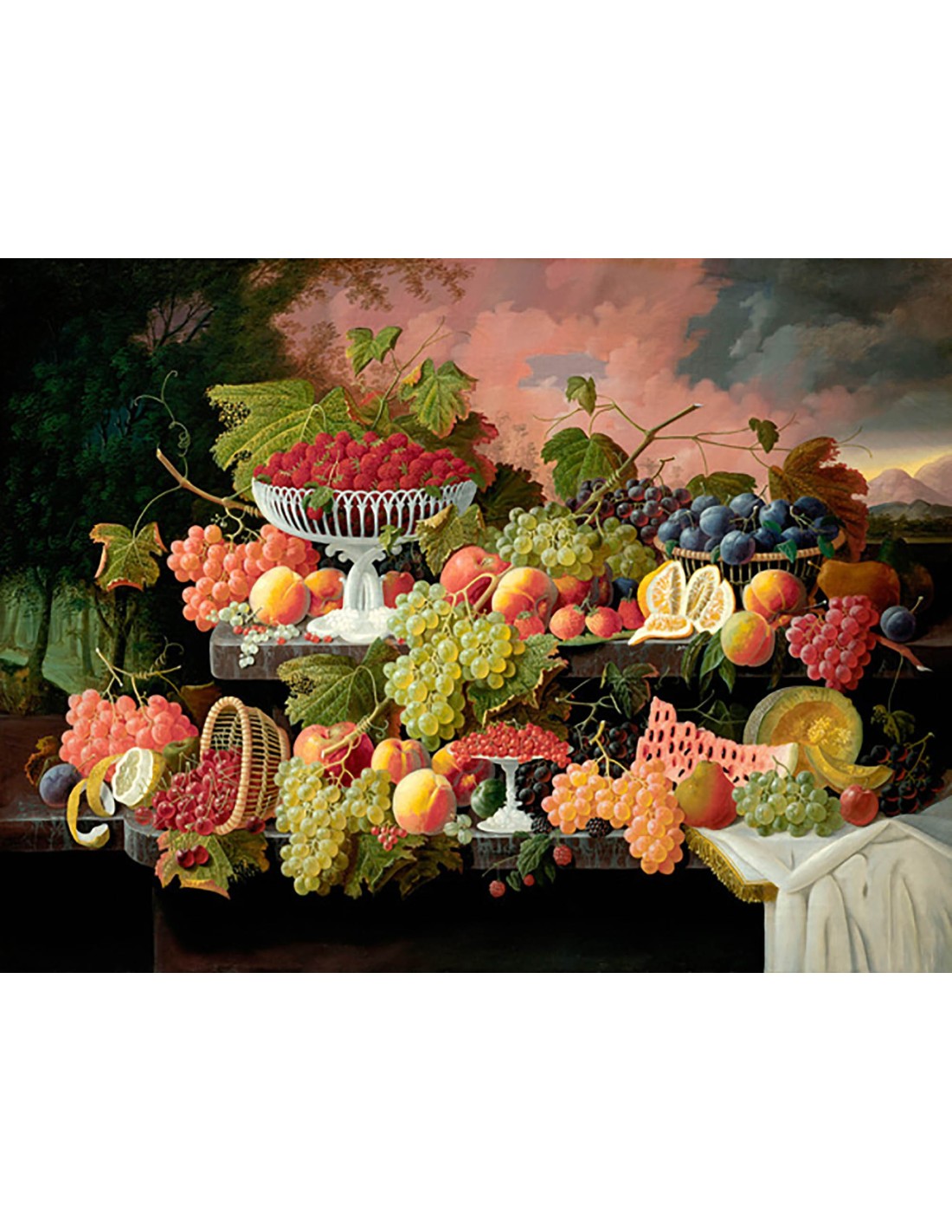 Bodegón de dos niveles con frutas y paisaje al atardecer