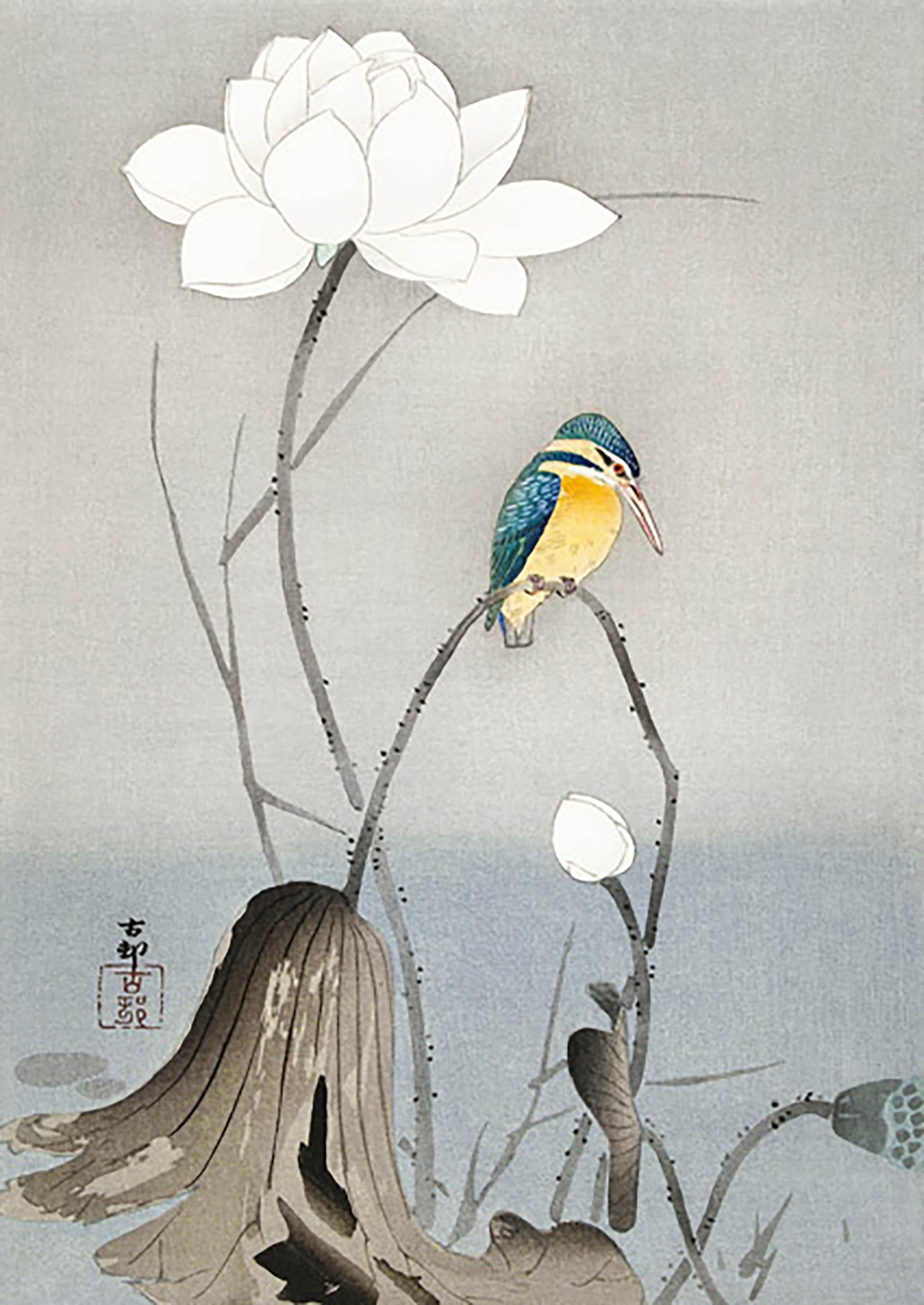 Martín pescador con flor de loto
