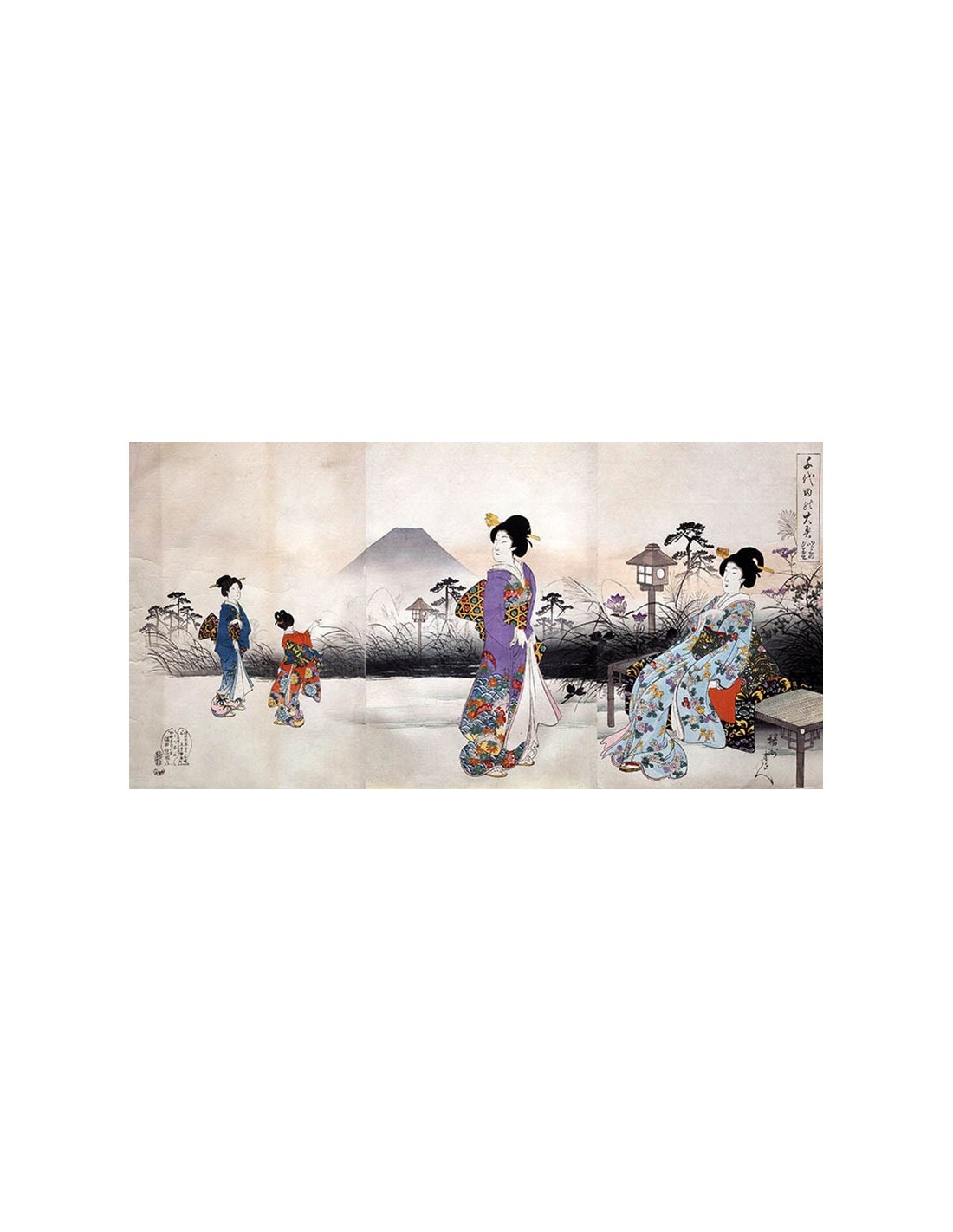 Japoneses en el paseo frente al monte Fuji